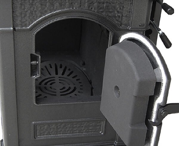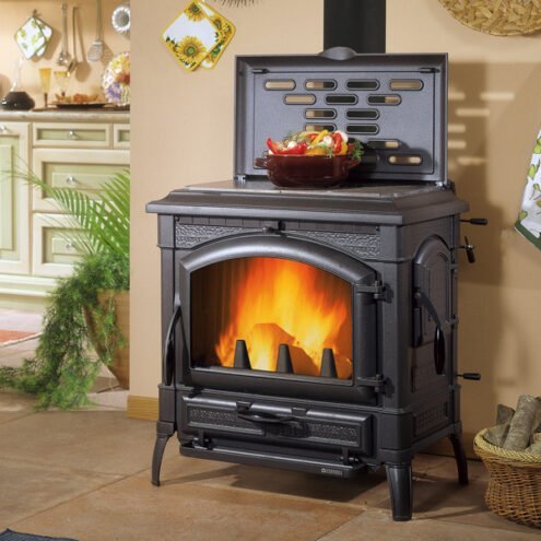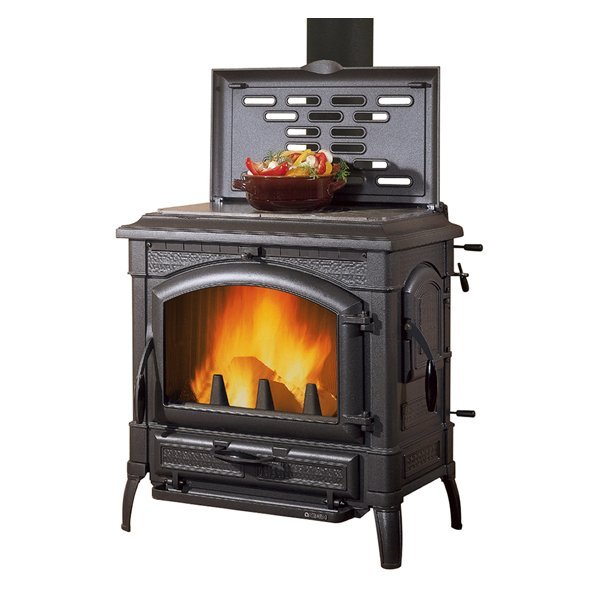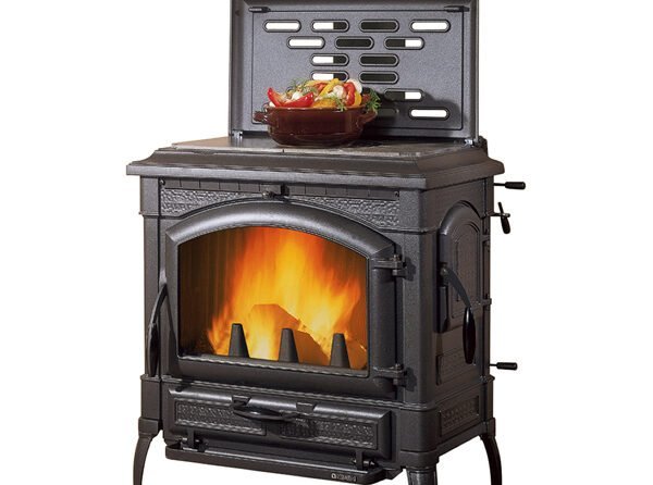 Il dispose d’une plaque de cuisson avec anneaux amovibles, d’une porte latérale pratique pour le rechargement du bois, ainsi que d’un système de double arrivée d’air (primaire et secondaire) pour une combustion optimisée et une vitre toujours propre grâce à la scheibenspülung (airwash).